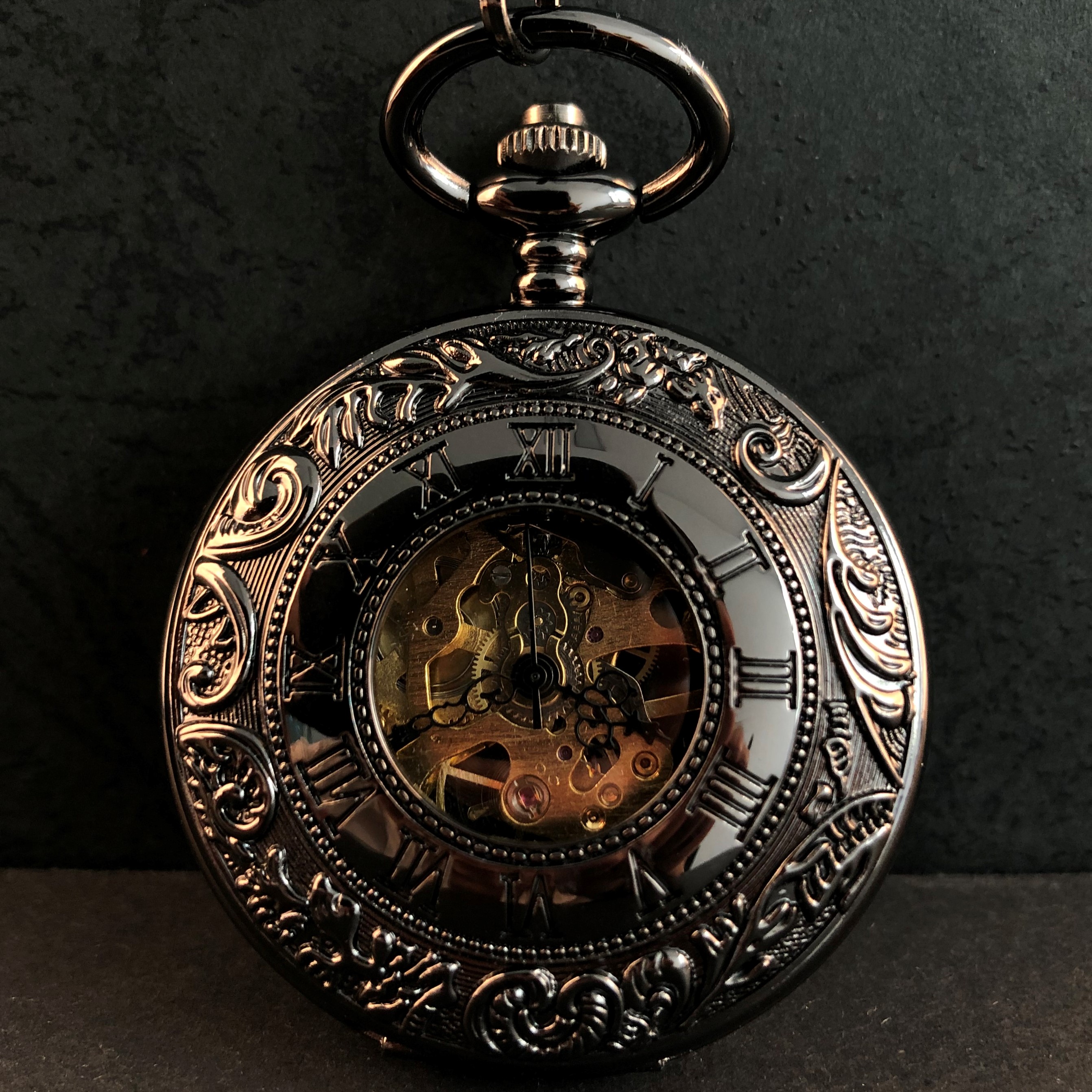 5pcs/set All Black Vintage Charm Pocket Watch Personalised Roman Numerals Case Mechanical Pockets Watches with Chain Gifts