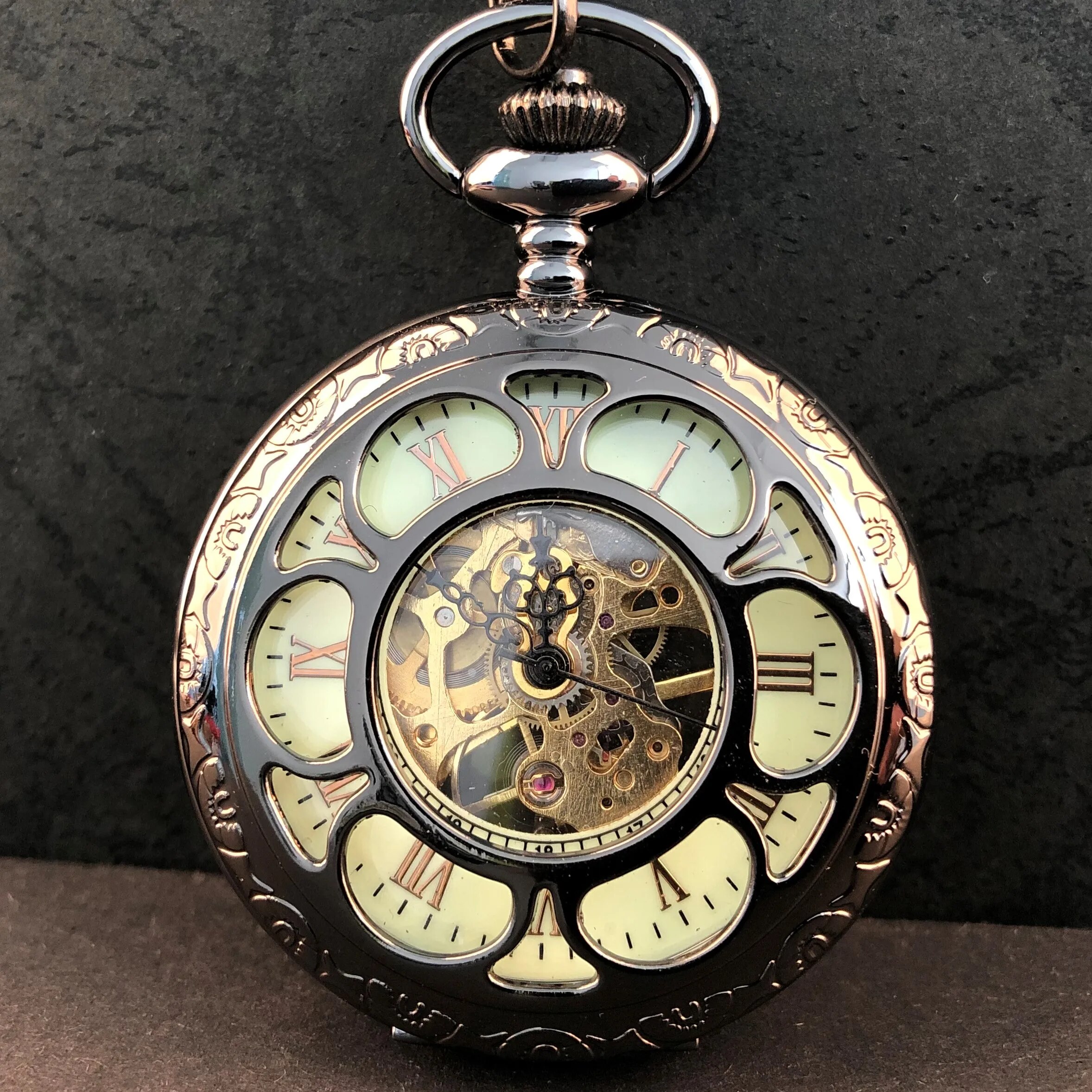 5pcs/set Black Charm Vintage Mechanical Pocket Watch Necklace For Women Men Personalised Skeleton Hand Wind Fob Watch with Chain Gifts