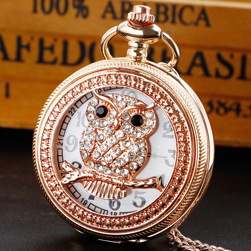 Charming Diamond-encrusted Luxury Owl Hollow Quartz Pocket Watch Necklace Sweater Pendant Handicraft Artwork Chain Clock