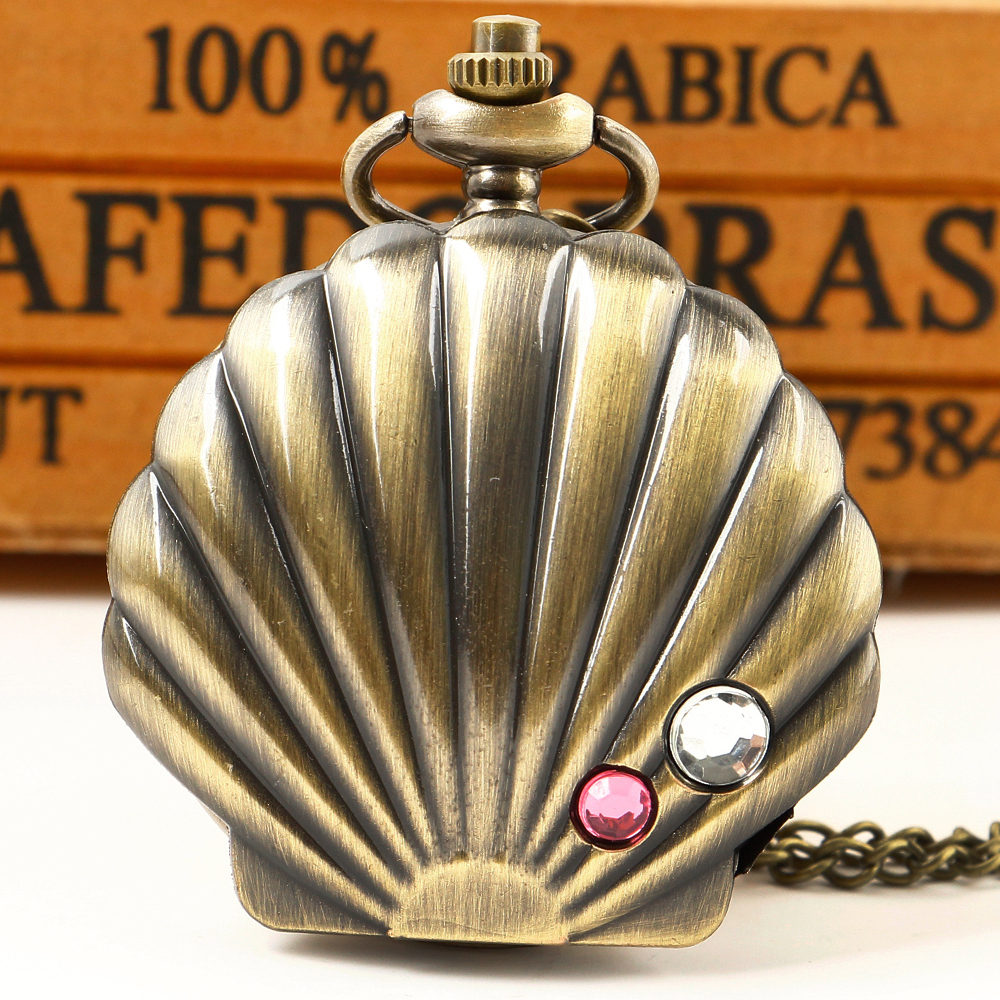 New Fashion Mermaid Shell Pocket Watch Unique Glossy Metal Scallop Case Crystal Pendant Necklace Superb Clock + Shell Accessory
