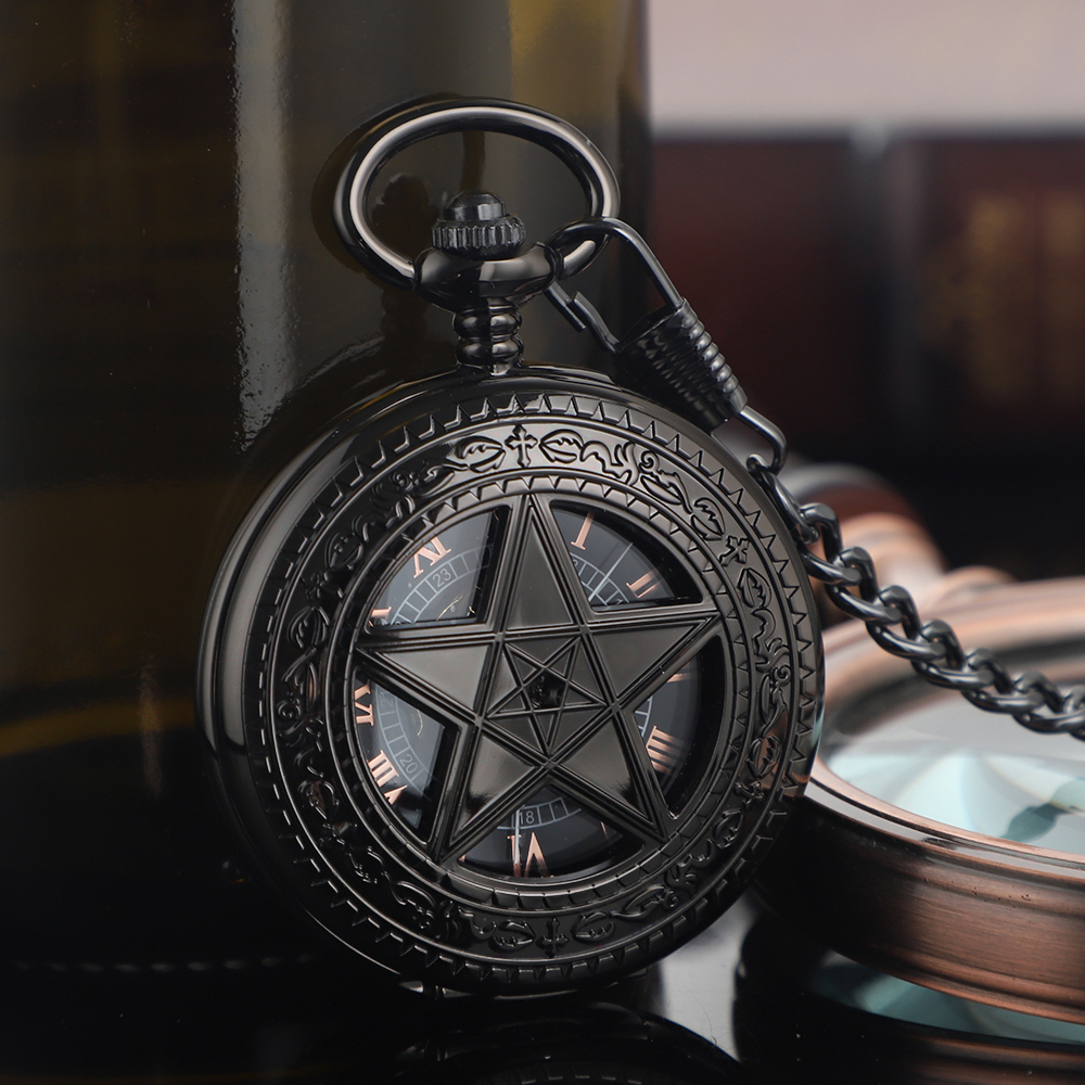 Retro Mechanical Hand Winding Pocket Watch Hollow Star Arabic Numerals Dial Vintage Black Fob Chain Pocket Pendant Watch Gift